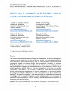 Este estudio examinó los métodos de investigación empleados en el campo de la lingüística inglesa en revistas académicas del área de Ciencias Sociales y/o Humanidades publicadas por la Universidad de Panamá entre 2018 y 2020. El principal criterio de elegibilidad fue la investigación original, no ensayos ni otros tipos de informes. Se utilizó un protocolo PRISMA para seleccionar la muestra resultando en 19 artículos de ocho revistas que fueron analizadas bajos los criterios de la Teoría Fundamentada. Se encontró que la mayoría de los estudios publicados (58%) utilizaron métodos cuantitativos, centrándose en estudios exploratorios y descriptivos. Las encuestas y cuestionarios fueron los instrumentos y/o técnicas más comúnmente empleadas en los estudios cuantitativos. En cambio, los métodos de investigación cualitativa utilizados en un 16% se caracterizaron por el uso de entrevistas grabadas y el análisis documental. Estos hallazgos recalcan la necesidad de diversidad metodológica en la investigación lingüística, y estos resultados pueden servir como punto de partida para futuros estudios que busquen ampliar y diversificar los métodos empleados en el campo de la lingüística inglesa.