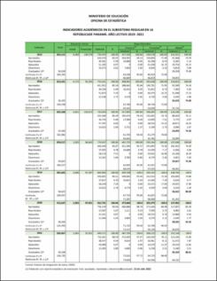 Tablas de datos; INDICADORES ACADÉMICOS EN EL SUBSISTEMA REGULAR EN LA REPÚBLICADE PANAMÁ. AÑO LECTIVO 2019- 2021, INDICADORES ACADÉMICOS EN EL SUBSISTEMA REGULAR EN LA DEPENDENCIA OFICIAL. AÑO LECTIVO 2015- 2021, INDICADORES ACADÉMICOS EN LA DEPENDENCIA PARTICULAR. AÑO LECTIVO 2019- 2021 .
